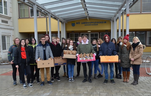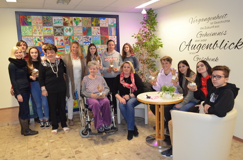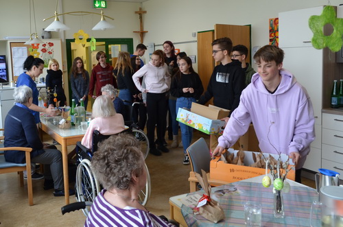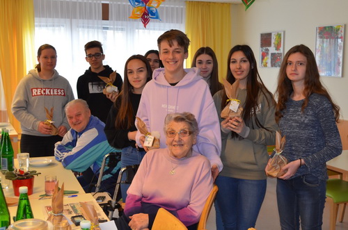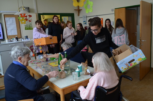Am 20. März war es dann soweit. Die Osternester wurden von den SchülerInnen an die Pensionisten verteilt. Die Freude war groß – nicht nur bei den Heimbewohnern. Auch die SchülerInnen und die zuständigen LehrerInnen erfreuten sich an dem Verteilen der vorösterlichen Geschenke und an den lachenden Gesichtern der Pensionisten.